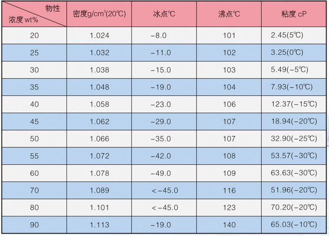LM-4系列冰河冷媒由二元醇改性構(gòu)成,主要添加劑包括防腐蝕劑,防霉劑,增溶劑,水穩(wěn)劑等。外觀為淺色液體。安全低毒、無異味、不易燃、不易揮發(fā)。20℃時(shí),原液密度為1.105~1.125g/cm',粘度為13.92mPa·s(cP),比熱為0.619cal/g℃,熱導(dǎo)率為0.26W/mK。沸點(diǎn)高于140℃,閃點(diǎn)高于120℃。